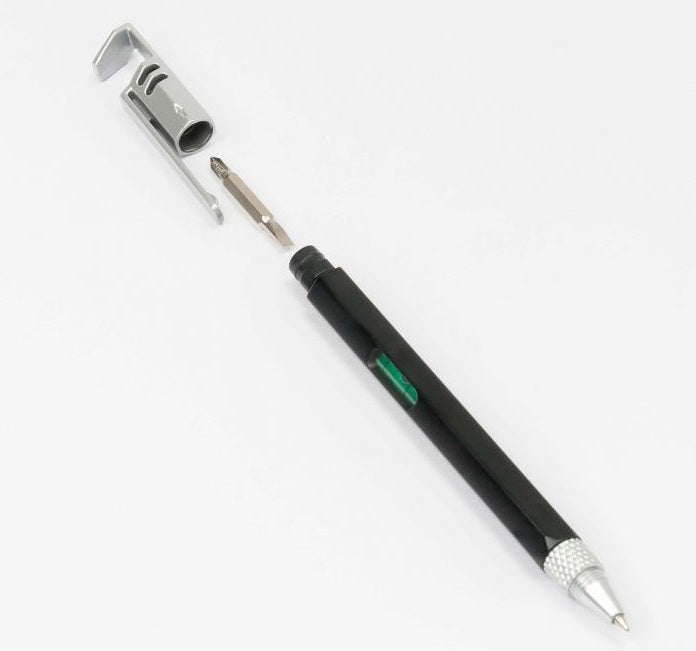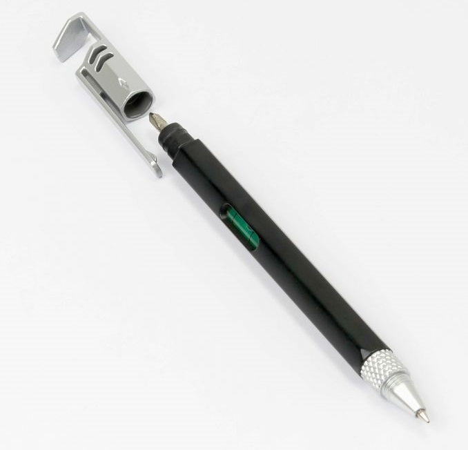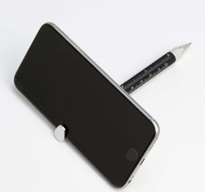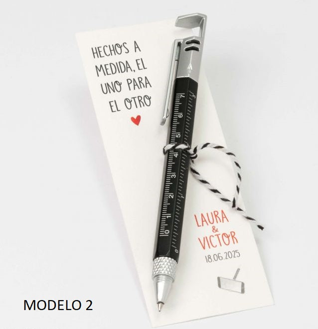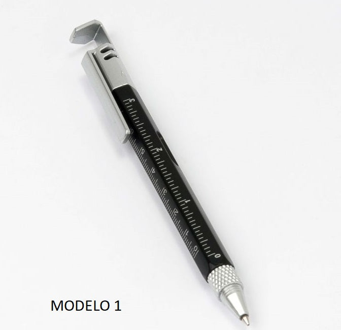Práctico y moderno bolígrafo multifunción, su forma única permite utilizar el bolígrafo como soporte para móvil, otras características de las que dispone es que tiene cinta métrica de 7cm., un pequeño nivel y un destornillador de doble punta (plana y estrella). Por su original y funcional diseño causará sensación entre los asistentes de cualquier evento como bodas, comuniones, fiestas de cumpleaños, regalos de empresa... Se puede presentar en un bonito punto de libro personalizado, en una cajita con unos dulces... las opciones son infinitas.