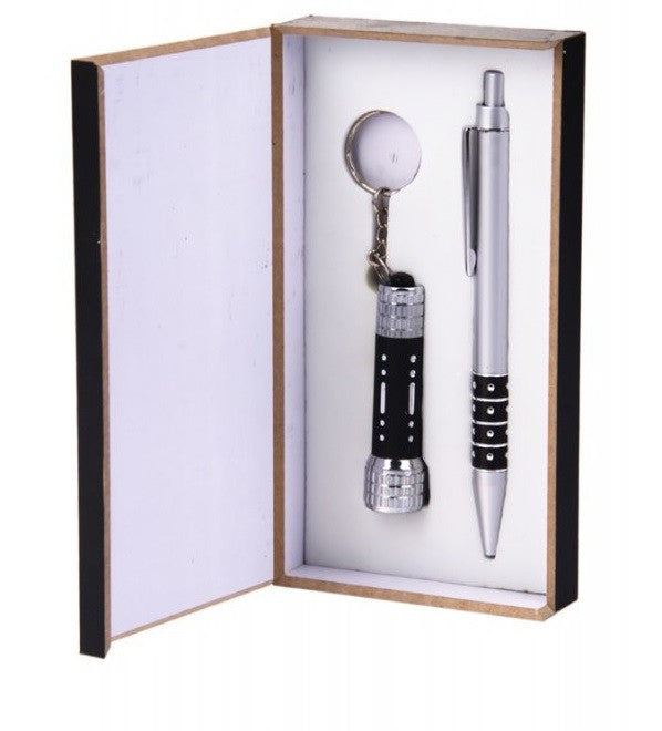 Caja de regalo bolígrafo y llavero linterna en cajita de madera.