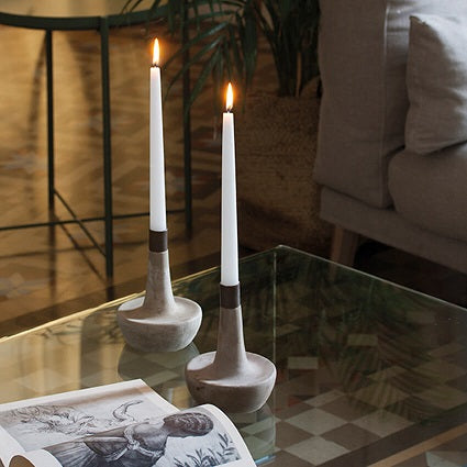 Candelabro de piedra ecológica moldeada a mano con 6 velas de color blanco en acabado mate. La parte superior del candelabro, que sujeta la vela, es de hierro envejecido.