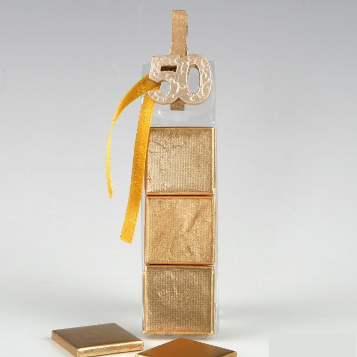 Dulce recuerdo donde los haya es una combinación preciosa del envoltorio de las chocolatinas con la pinza del 50 aniversario. Es una pinza muy representativa tanto como símbolo de unas bodas de oro o como el 50 cumpleaños de una persona o empresa. Puede presentarlo dentro de un bonito cesto o una bandeja para que sus invitados se sirvan ellos mismos o puede dejar uno en cada silla junto con una tarjeta para marcar el lugar de cada invitado en la mesa.