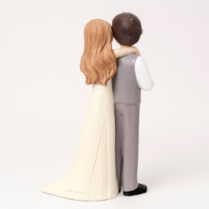 Bonita e informal figura de pastel de 21 cm en la que la novia abraza cariñosamente al novio.