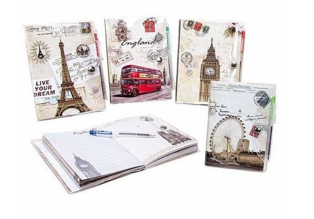 Libreta de notas estilo vintage modelo postal con bolígrafo.