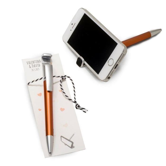 Práctico y moderno bolígrafo para regalar gracias a su mecanismo para borrar las huellas de las pantallas de móviles y tablets. Su forma única permite utilizar el bolígrafo como soporte para móvil. Se presenta en un original punto de libro de cartulina.