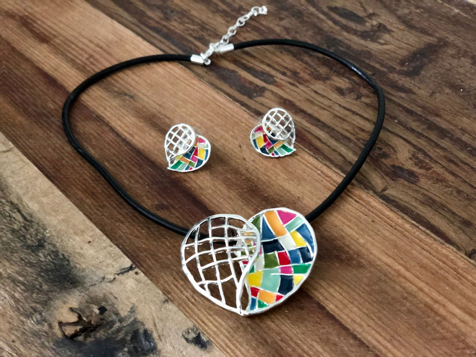 Conjunto de gargantilla y pendientes en colores craquelados estilo Gaudí con forma de corazón. Ideal para darse un capricho, regalar y como detalle de boda para las invitadas.