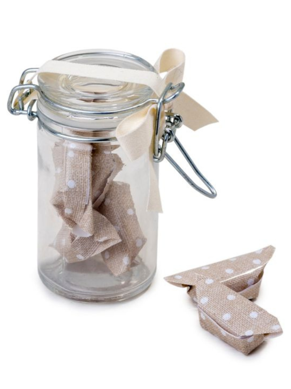 Bonitos tarritos de cristal con tapón de cierre palanca. En esta ocasión, los hemos decorado con 4 deliciosos caramelos de sabor afrutado envueltos en un vistoso papel marrón a topos blanco de diseño exclusivo. Cierra el tarrito una práctica tapa con palanca para dejar hermético el contenido con lazo en cinta de algodón marfil a juego con los caramelos. Es un detalle perfecto para regalar a los invitados de una fiesta de cumpleaños, babyshower, bautizo...Si al frasquito le añade un adhesivo con el nombre del homenajeado, tendrá un detalle único para ese día.