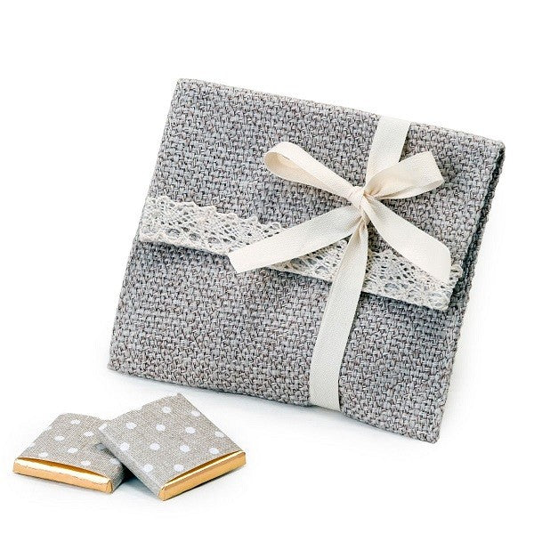 Estas elegantes y románticas bolsitas son perfectas como detalle para los invitados a un evento. Muy demandadas en las bodas vintage y de bodas temática romántica. Decoradas con una bonita cinta de puntilla a modo de pasamanería y una delicado lazo de cinta de algodón en color marfil. La bolsita contiene en su interior, 2 deliciosos chocolates con leche al 32% de cacao para sorprender a los invitados.
