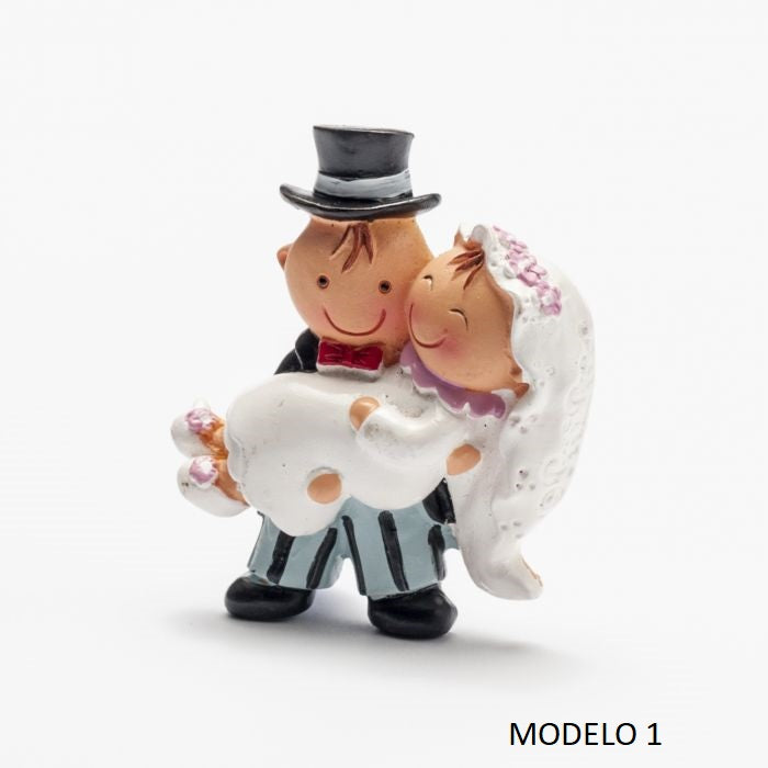 Divertido imán de 5cm en resina con el novio Pit levantando en brazos a Pita. Una vez pasada la celebración los invitados lo utilizarán a diario en la nevera o cualquier otra superficie metálica.