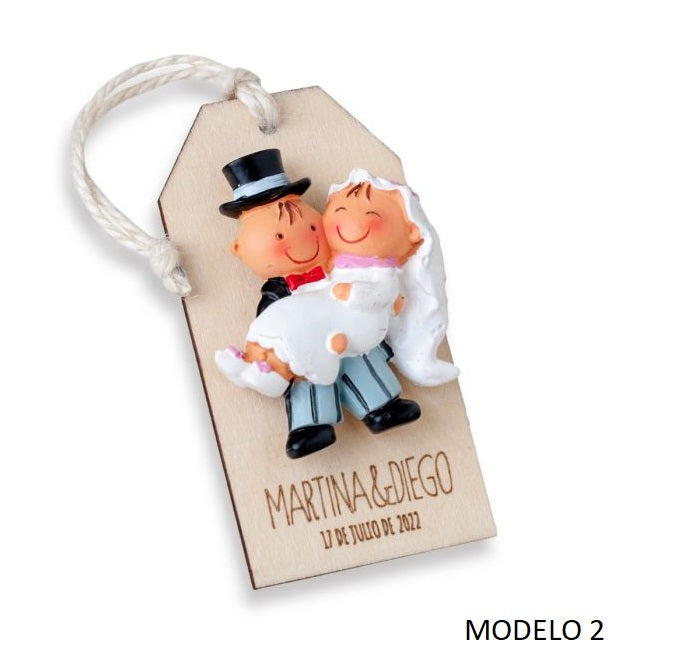 MODELO 2: el imán va pegado a una original tarjeta de madera. Colgante de tarjeta de madera e imán Pit&Pita el día de su boda perfecto para regalar a los invitados.