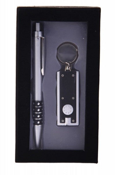 El set está compuesto por un elegante bolígrafo y llavero linterna LED a conjunto, presentado en elegante cajita de regalo de cartón negra. Elegante y práctico recuerdo para los invitados a tu boda.