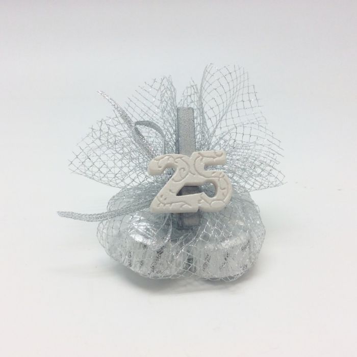 Orné d'un sac en tulle argenté avec 4 chocolats à l'intérieur.