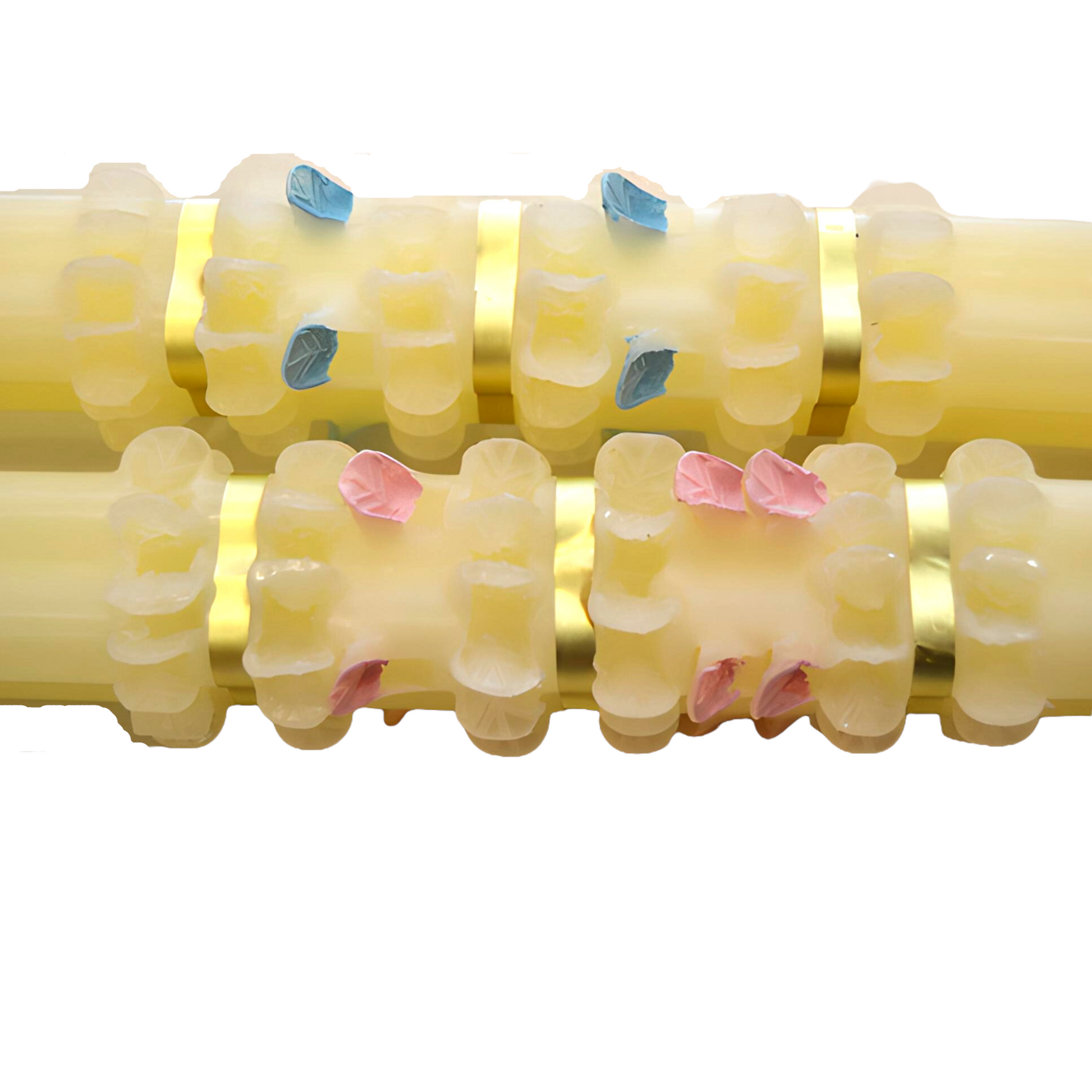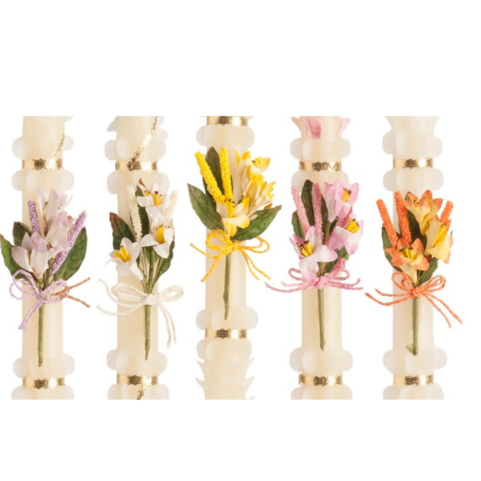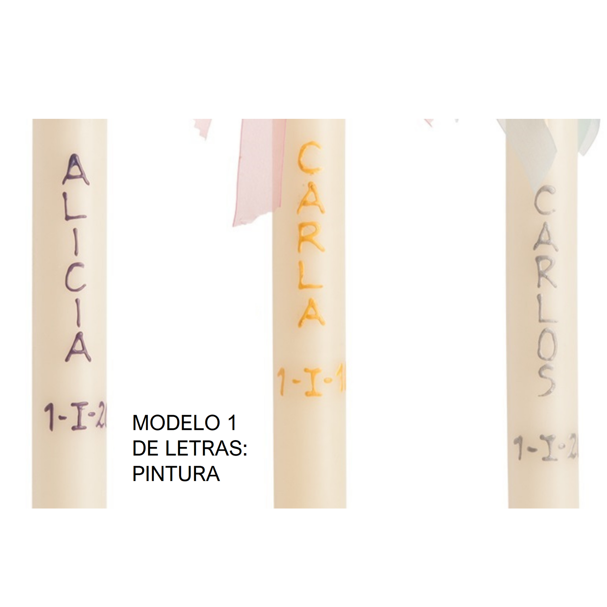La bougie de baptême Il peut être décoré sur le devant d'un bouquet de fleurs séchées et d'un nœud en tissu et cordon. Dans le cas de l'application du décor de fleurs séchées, le personnalisation est gravé au dos du bougie .
