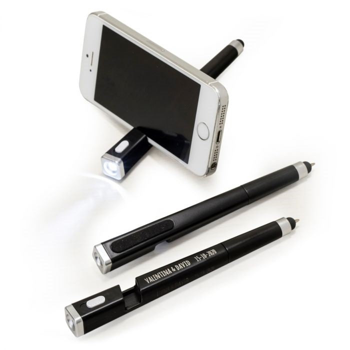Práctico y moderno bolígrafo para regalar como detalle de boda gracias a su puntero habilitado para funcionar sobre pantallas de móvil o tablets, su linterna con luz led y su forma única permite utilizar el bolígrafo como soporte para móvil.