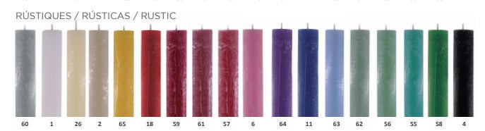 Vela cilíndrica disponible en varios colores, con acabado rústico.
