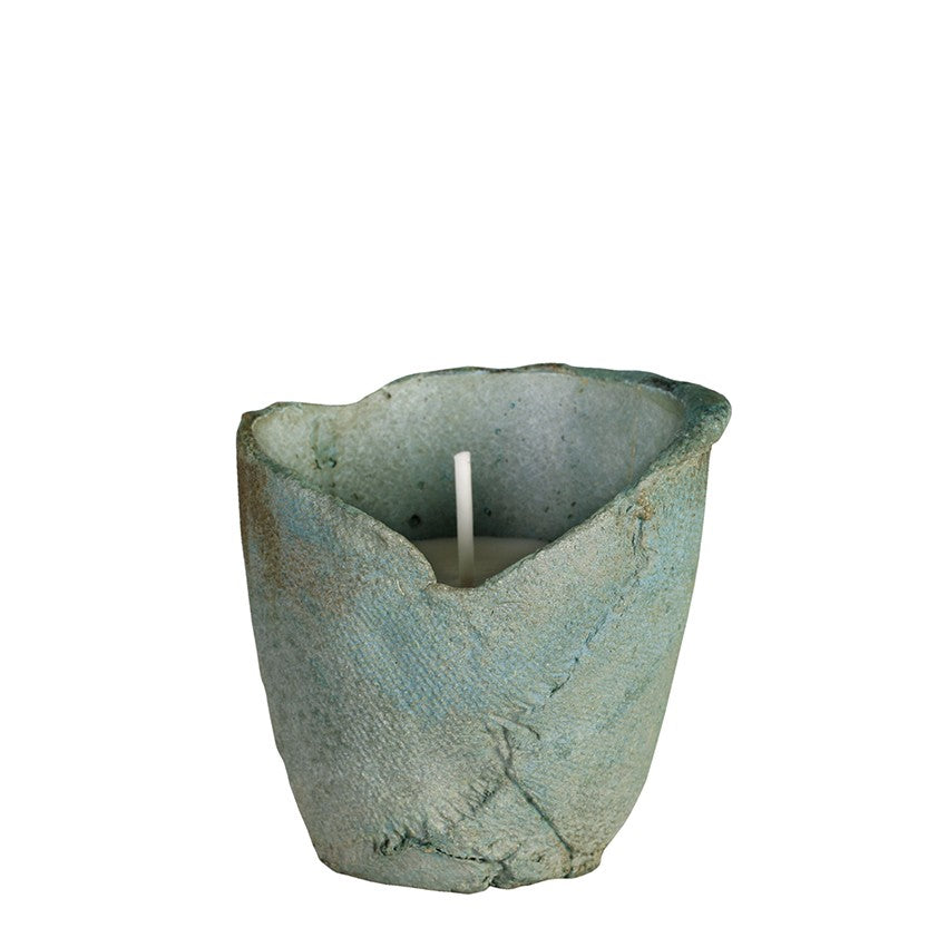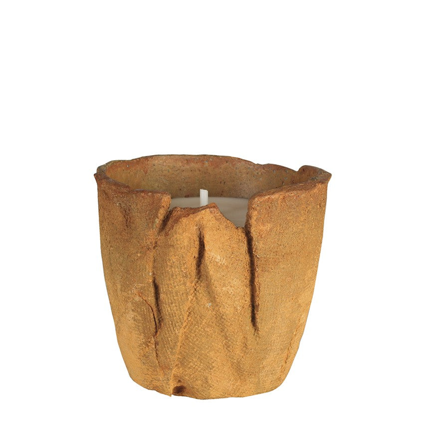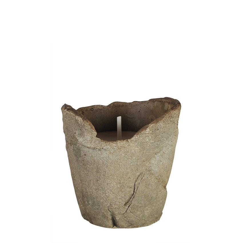 Vela antimosquitos en tiesto de piedra orgánica con forma de tulipa.